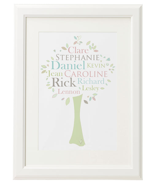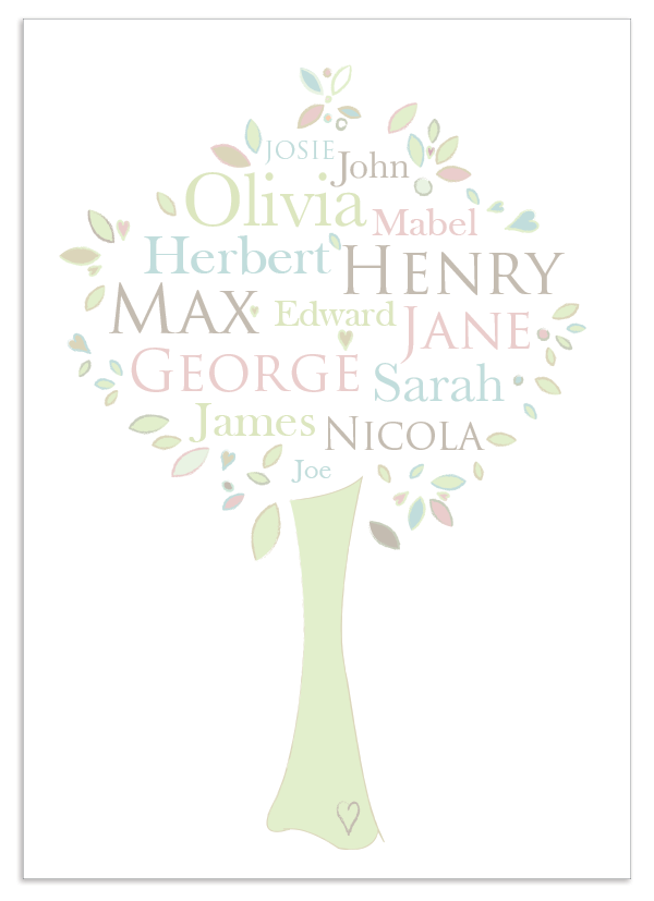 A gorgeous heart shaped tree design with taupe, duck egg, pale pink and sage green colours. Choose from pale greys or sage, pink taupe and blue. Personalise with up to 25 names and we will design, print and package your family tree off to you.