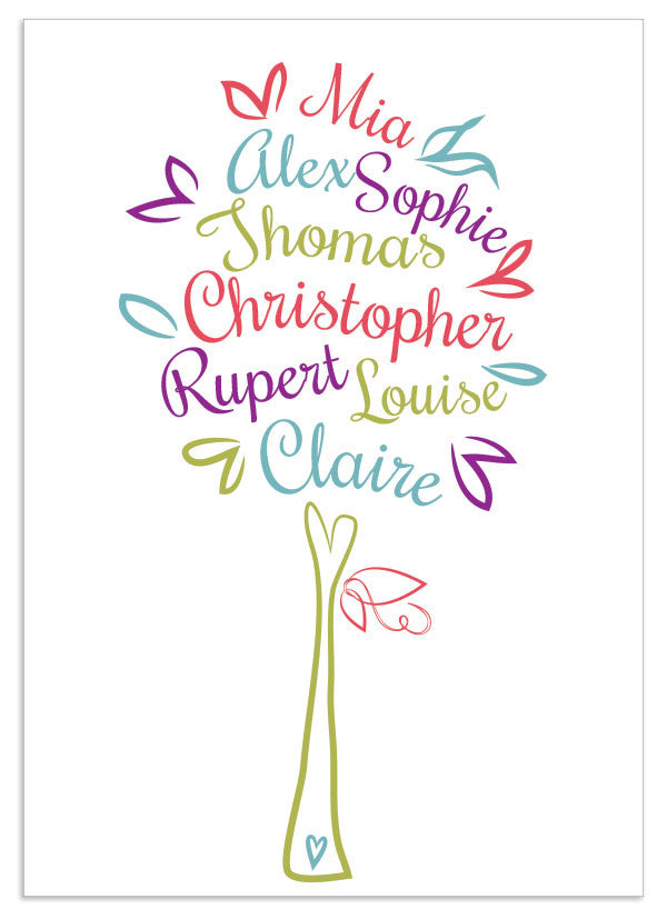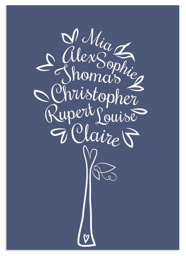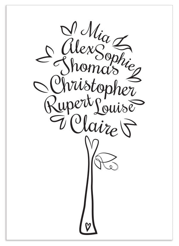 The wonder of this design is the gorgeous curling lettering which makes the tree look so beautiful. Personalise with up to 40 names and we will design, print and package your family tree off to you.